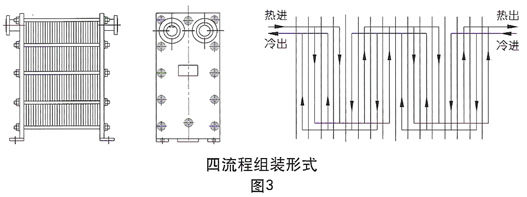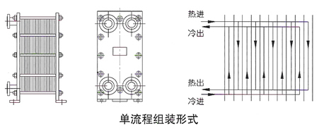 板式換熱器根據介質的溫差和流量,可以裝配成單流程、雙流程、三流程以及多流程的形式。單流程是指介質在換熱器內流過一個流程,雙流程是指介質在換熱器內折返流過兩個過程,依次類推,各種流程的外形圖和其流程示意圖如圖3。當采用多流程時,換熱器的四個接口就不能在同一側的夾緊板上,進出口要位于前后兩個夾緊板上。