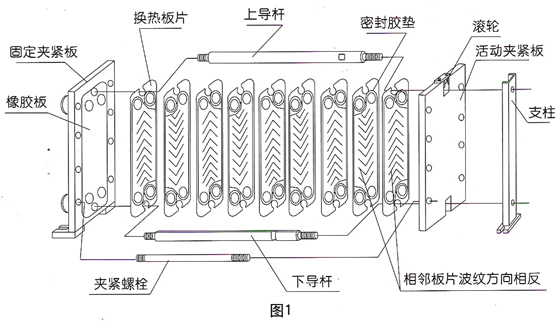 板式換熱器的結構分解如圖1,產品外型如圖2,主要部件是由換熱板片、密封膠墊、夾緊板、導桿、夾緊螺栓組成。換熱板片是由不銹鋼板壓制成型,它上面開有4個流道孔,中部壓成人字形波紋,四周壓有密封槽。密封槽內粘有密封膠墊。換熱板片通過兩導桿定位對齊,兩夾緊板通過夾緊螺栓將各板片壓緊,從而形成換熱器內腔換熱流道。相鄰換熱板片的人字形波紋方向安裝時相反,接觸點彼此相互支撐。人字形波紋和這些支撐點使流體介質在其內部流動時充分形成湍流,這是板式換熱器具有很高換熱效率的主要原因。另外換熱板片厚度較薄,導熱熱阻較小,板片兩側的流體介質流動分布較為均衡,也使得傳熱較為充分。